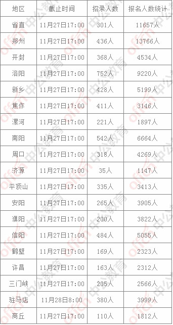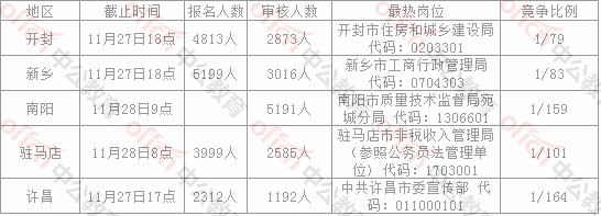 中公教育還就各地區(qū)的各崗位具體報(bào)名人數(shù)進(jìn)行了統(tǒng)計(jì)分析,截至11月27日,河南省考部分地區(qū)崗位的具體報(bào)名情況如下: