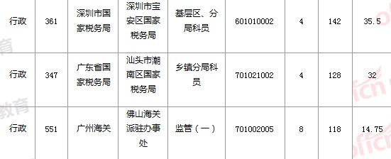 報名通過審核人數(shù)前十的職位主要集中在廣東省國家稅務(wù)局、廣州海關(guān),國土資源部直屬系統(tǒng)等部門,具體信息如下: