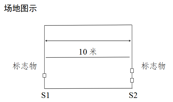 動作要求:受測試者采用站立式起跑,聽到發(fā)令后從S1線外跑到S2線前(腳不得踩線)用手將豎立的木塊推倒后折返,往返跑2次,每次推倒1個(gè)木塊,第2次返回時(shí)沖出S1線。
