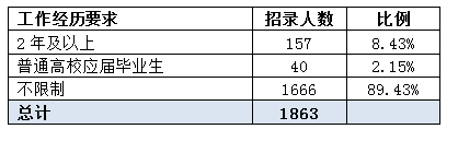 通過對(duì)基層工作經(jīng)驗(yàn)的分析,中公網(wǎng)校專家發(fā)現(xiàn),招錄計(jì)劃中的1706人不要求工作經(jīng)歷,占到總?cè)藬?shù)的91.57%,其中有40人只招錄高校應(yīng)屆生,應(yīng)屆生們要重點(diǎn)考慮這類職位,縮小競爭對(duì)手范圍,概率。