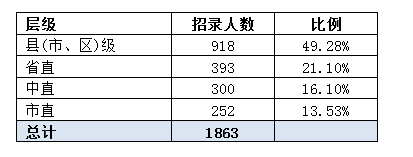 本次招錄涵蓋了各個(gè)層級(jí),其中縣級(jí)占總?cè)藬?shù)比例,為49.28%,其次是省直機(jī)關(guān),招錄398人,占總?cè)藬?shù)的21.1%,國稅系統(tǒng)為國家垂直機(jī)構(gòu),招錄300人,占到總?cè)藬?shù)的16.1%,市級(jí)招錄規(guī)模最小,僅招252人,占到總?cè)藬?shù)的13.53%。從這些數(shù)據(jù)可以看出,縣級(jí)職位機(jī)會(huì),有志在2016年成“公”的考生要認(rèn)真考慮縣級(jí)職位。